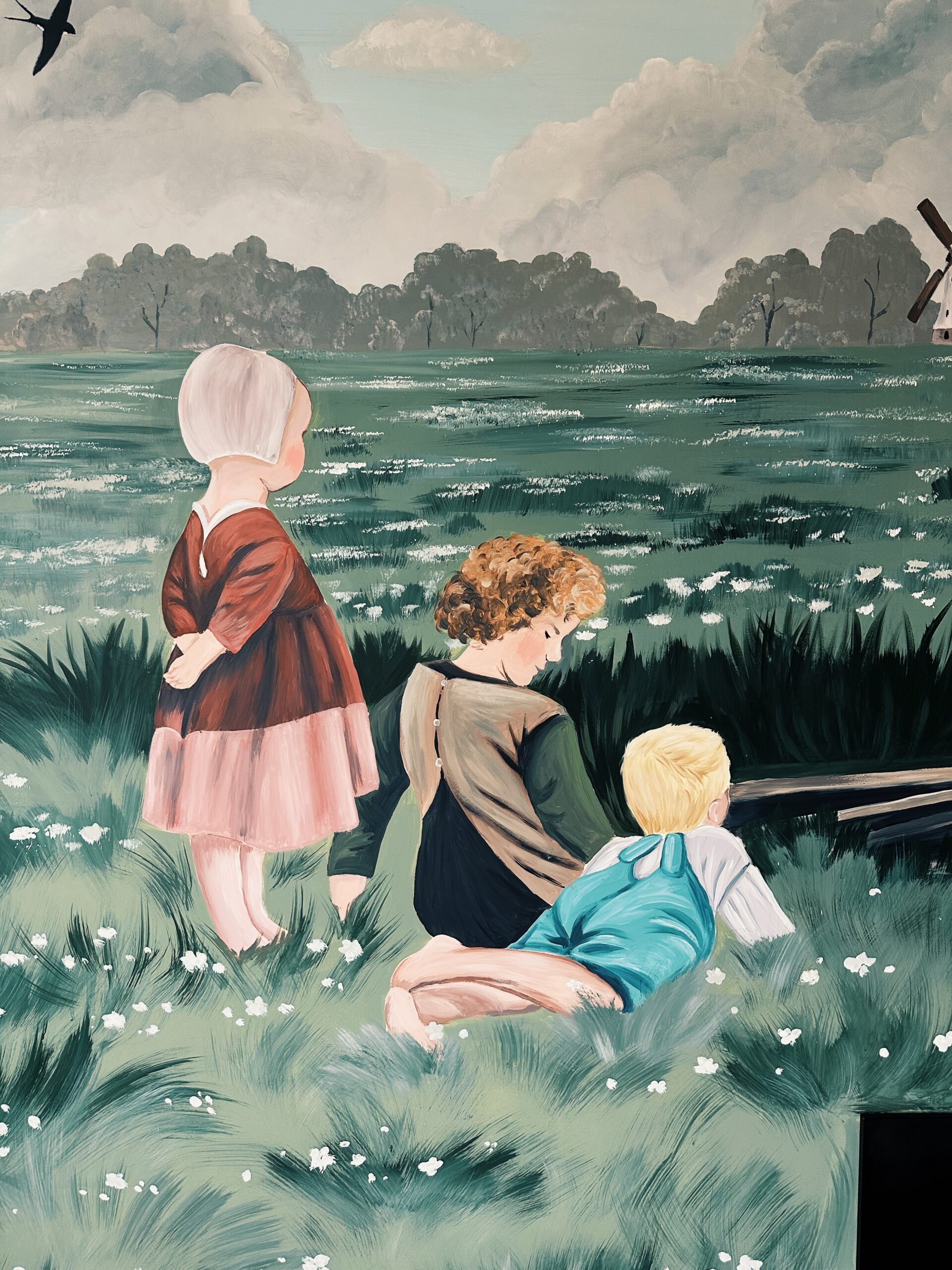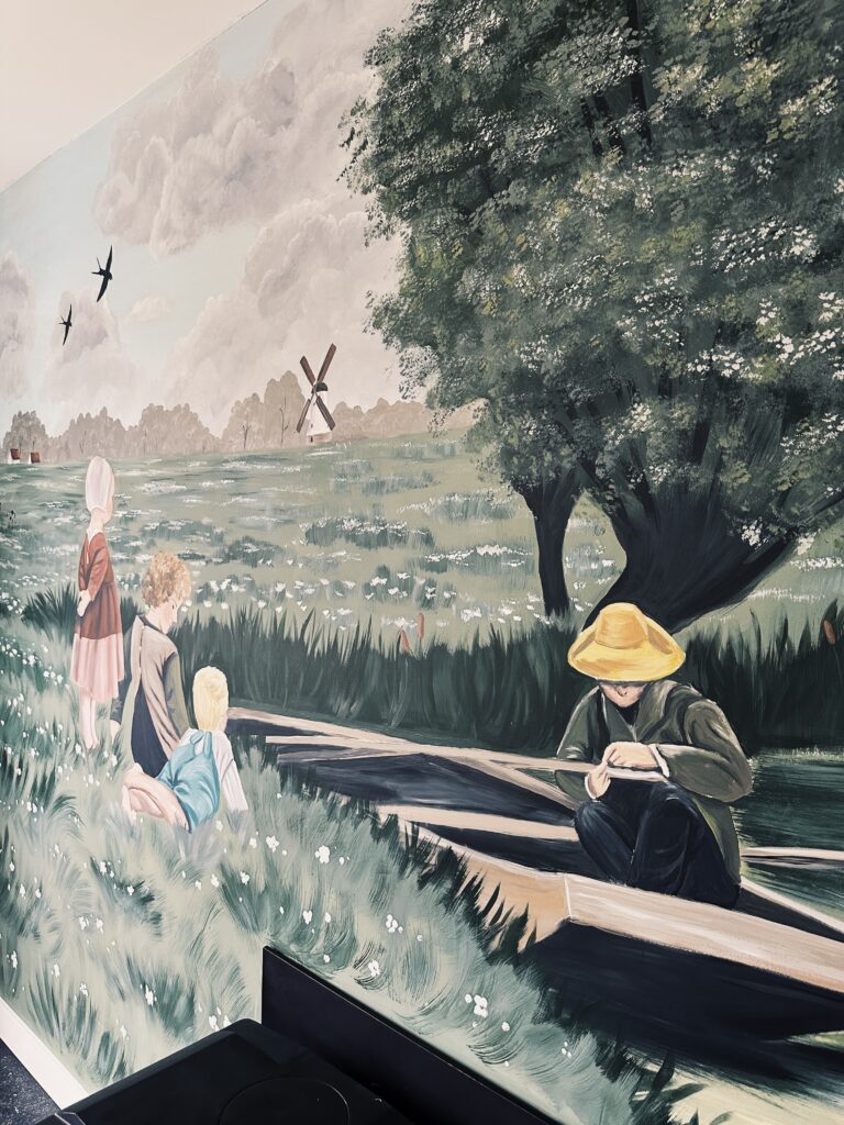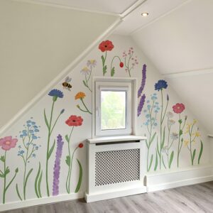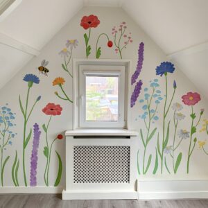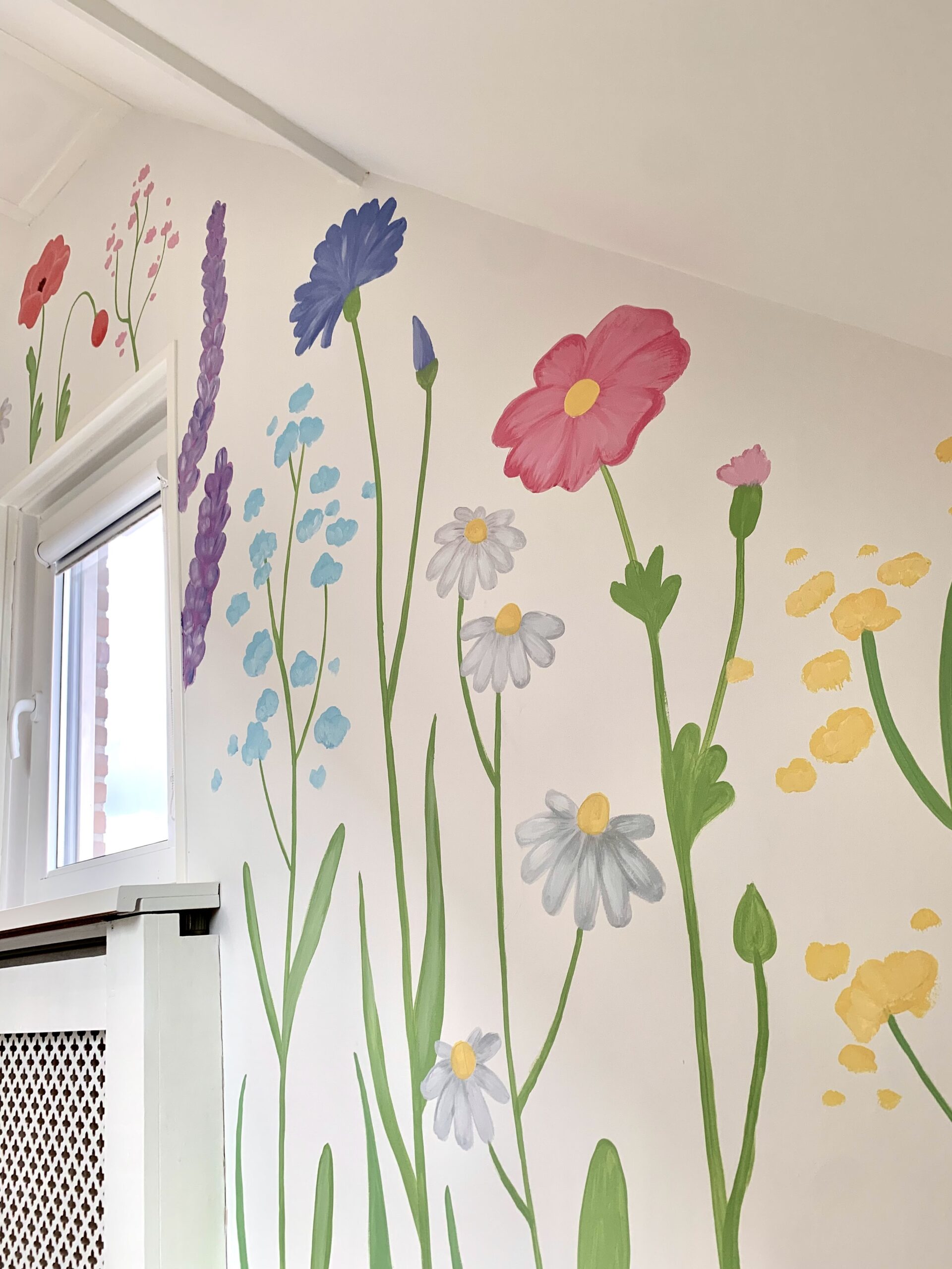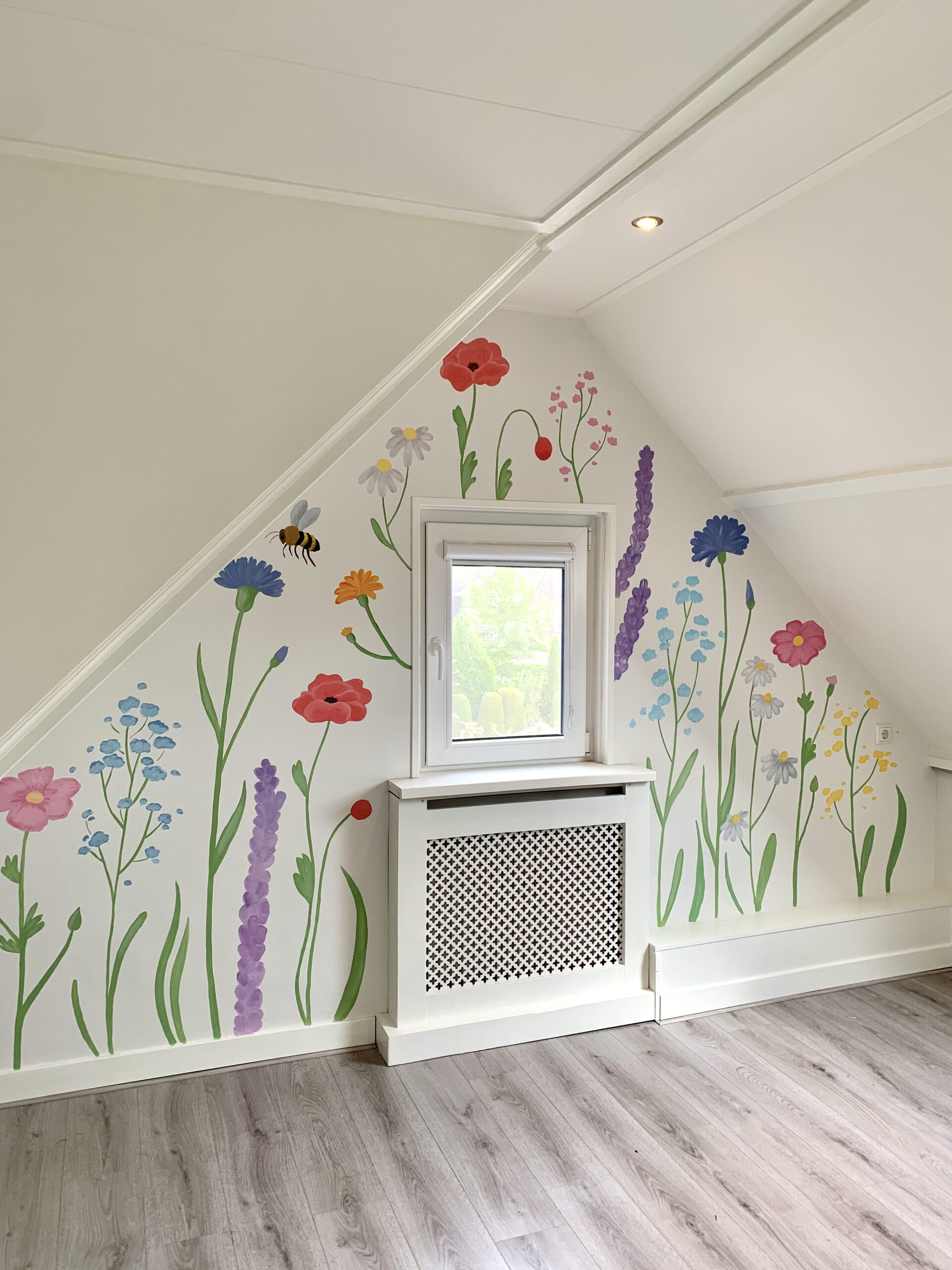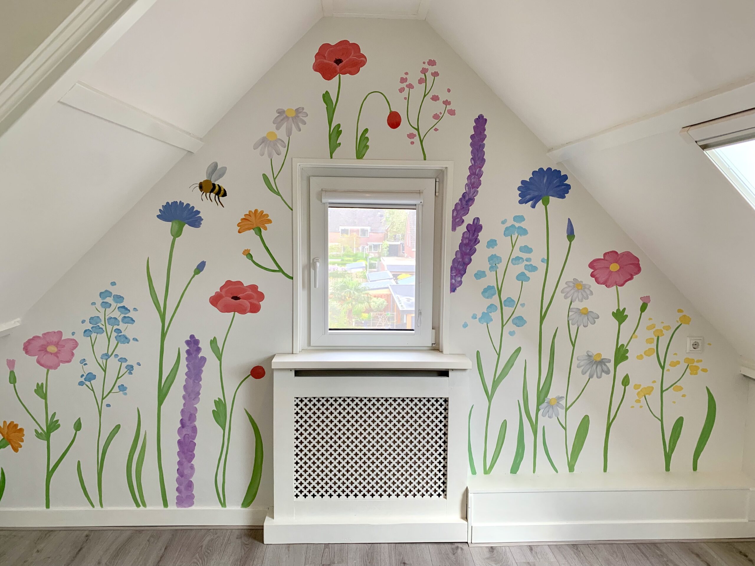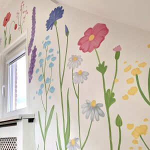 Voor sommige muurschilderingen gebruik ik mijn beamer, daarmee projecteer ik de schets of illustratie op de muur. Daardoor kan ik heel precies werken. Maar sommige muurschilderingen schilder ik los uit de hand, zoals de vrolijke bloemenmuur!